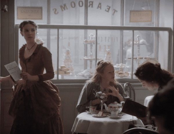 Esto ocurre en el minuto 42:15 cuando Enola visita un café en búsqueda de su madre perdida. En una de las mesas se puede ver a dos jóvenes, una de pelo rojo y otra de pelo negro. Inmediatamente los seguidores de Anne with an E las identificaron como Anne y Diana, y aunque claramente no son las actrices Amybeth McNulty y Dalila Bela.