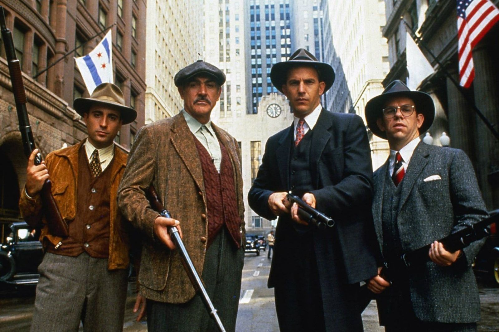 La cinta dirigida por Brian De Palma se volvió un clásico dentro del género de thriller policíaco. La trama se sitúa en Chicago en los años 30, donde imperaba la Ley Seca, allí no encontramos con el agente Eliot Ness, interpretado por Kevin Costner, quien se encuentra tras los pasos del amo de la mafia Al Capone (Robert De Niro). La falta de pruebas le impide a Ness acusarlo de los crímenes que ha cometido, pero con la ayuda del agente Jim Malone, interpretado por Connery, y otros dos policías, encontrarán la forma de llevarlo a la justicia.