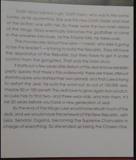 El plan original de Lucas con la nueva trilogía era llevar todo poco tiempo después de los evento del “Regreso del Jedi” (1983). En este contexto, Leia y Luke, quienes estarían iniciando la nueva Orden Jedi, deberían enfrentarse a este poderoso enemigo.