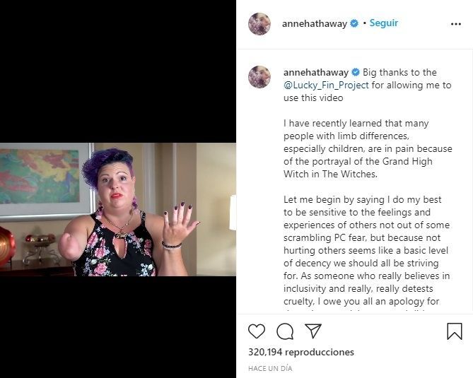 “Recientemente me enteré de que muchas personas con diferencias en las extremidades, especialmente los niños, sienten dolor debido a la representación de la Gran Bruja en ‘The Witches’”, indicó Anne Hathaway a través de su cuenta de Instagram (@annehathaway), en un posteo en el que también compartió un video de la asociación Lucky Fin Project, que busca visibilizar a las personas con discapacidad.