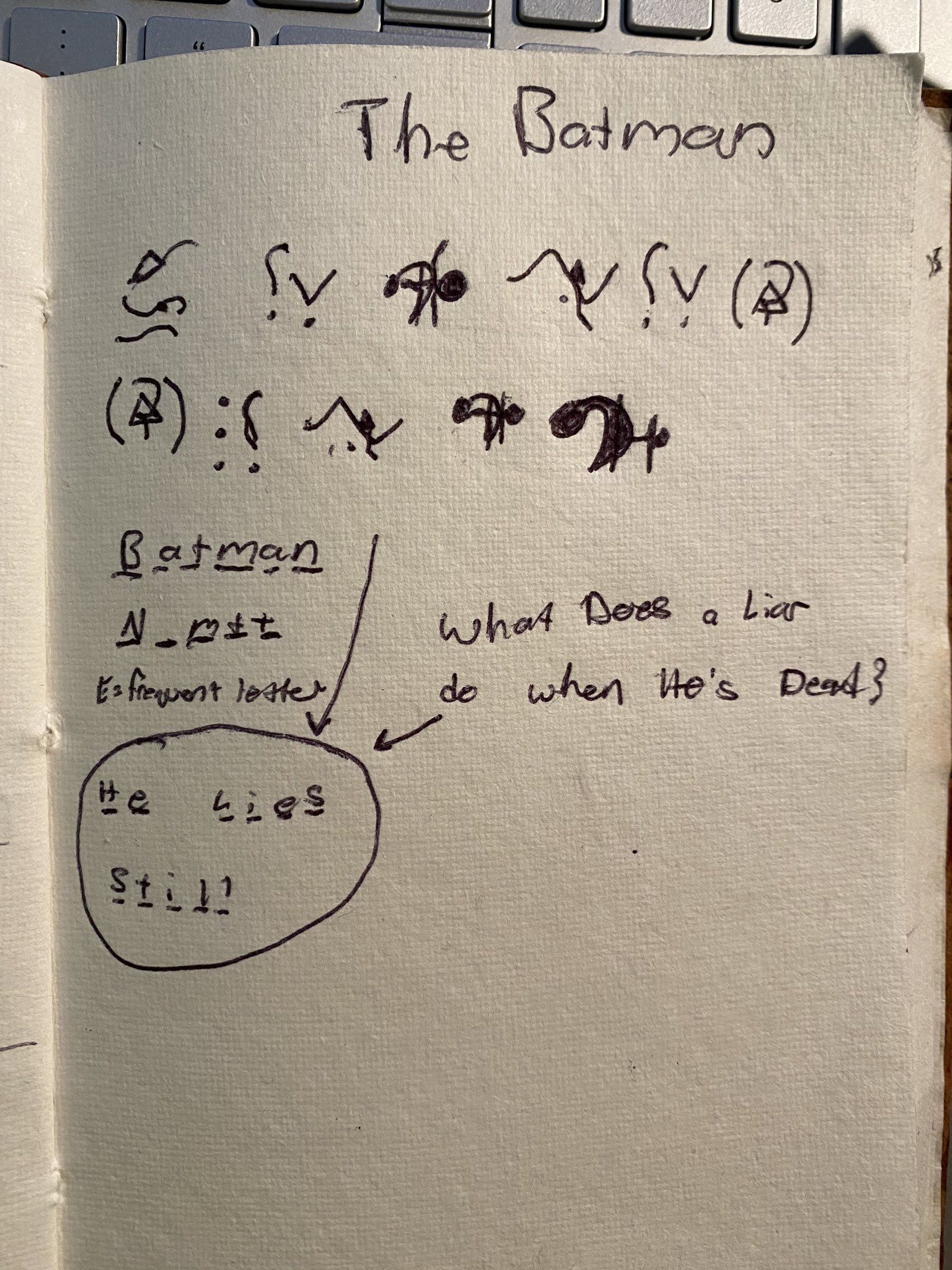 Lane explicó que primero observó todos los símbolos del mensaje, incluso los copió en un papel, y después de notar cuáles se repetían o eran similares, comenzó a darles valores mediante el alfabeto. Comenzó por utilizar The Batman como fuente principal y después fue tomando el resto de las letras del abecedario y este fue el resultado. Por lo cual la respuesta a la pregunta '¿Qué hace un mentiroso cuando está muerto?' sería 'Se queda quieto'.