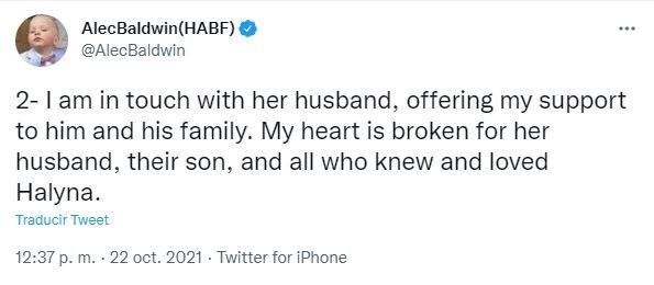 "Estoy en contacto con su esposo, ofreciéndole mi apoyo a él y a su familia. Mi corazón está roto por su esposo, su hijo y todos los que conocieron y amaron a Halyna", dice el segundo Tweet de Baldwin en relación al fatal hecho.