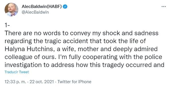 Alec rompió el silencio con un sentido mensaje en Twitter en el que se puso a disposición de la policía que investiga el hecho y ante la que ya declaro. Por el trágico hecho, no se presentaron cargos contra el actor ya que se trató de un desafortunado accidente.