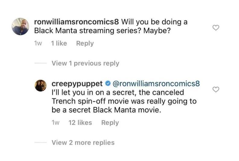 En dichas publicaciones, el director se dedicó a responder algunas preguntas. Una en particular fue si existía la posibilidad de hacer un spin-off de Black Manta., el personaje que será interpretado por Yahya Abdul-Mateen II. A lo que el director respondió: "Les contaré el secreto, el proyecto cancelado The Trench era en realidad una película secreta de Black Manta".