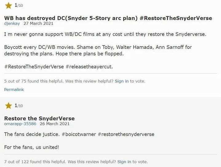 Godzilla vs Kong tiene un promedio de 7,4 sobre 13,925 votantes en IMDB y esto tiene que ver con el boicot que los fanáticos de Zack Snyder le están haciendo a la película, ya que pretenden que Warner Bros continúe dándole los filmes al director y no a otros realizadores. Tal es la obsesión con esta idea que hasta se ha creado una petición en Change.org y ya tiene casi 50 mil firmas.
