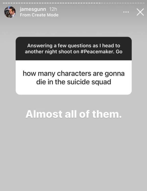 En una historia en Instagram, Gunn habló sobre lo que pasará con muchos de los personajes de esta película y la verdad que no ha reflejado alegría entre los fans. Un seguidor le preguntó sobre si morirán algunos personajes en la película, a lo que él contestó: "casi todos".