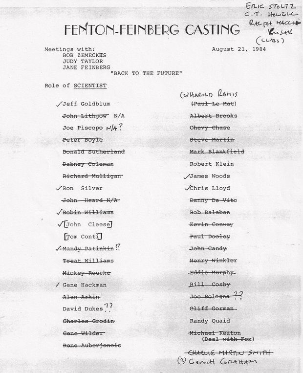 Ahora, gracias a Will McCrabb un fan del cine y usuario de Twitter, sabemos que el estudio tenía una larga lista con estrellas para el papel de Emmett Lathrop Brown. La lista tiene varios nombres tachados, donde se pueden encontrar a John Lithgow, Mickey Rourke, Eddie Murphy, Steve Martin, Donald Sutherland, Chevy Chase y hasta una de las estrellas favoritas de Mel Brooks, Gene Wilder.
