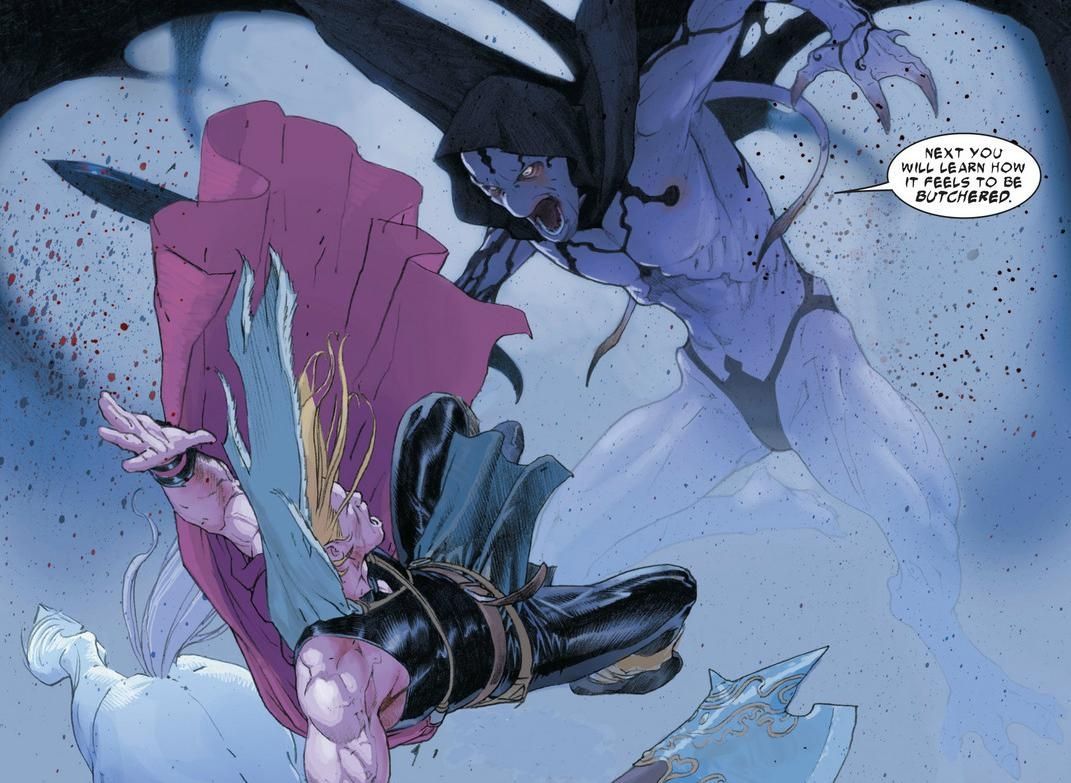 Para quienes no lo conozcan, “Gorr the God Butcher” apareció por primera vez en la saga de cómics ”Thor: God of Thunder“ de 2015, escrito por Jason Aaron e ilustrado por Esad Ribic. En el número 2 de esta historia, conocemos a este personaje que busca matar a todos los dioses del cosmos en venganza por no haber escuchado sus rezos y haber dejado que su familia y planeta sucumbieran. Gorr se encargará de destruir a los dioses extrayendo su poder con la antigua arma All-Black, la “Necrosword”. Sin que Gorr lo supiera, esta espada fue el primer simbionte (Venom, Carnage) jamás creado. En esta historia, Thor y Gorr tienen un encuentro y el Dios del Trueno con suerte pudo dar gracias de salir con vida.