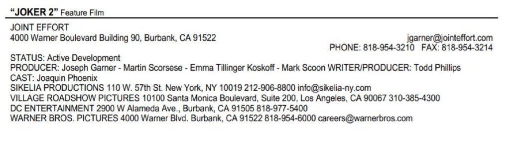 Según informó Production Weekly, el sitio especializado en informar sobre producciones que están en proceso para este año y los que vendrán, la secuela de Joker está en desarrollo. El sitio detalla que Martin Scorsese regresa como productor, al igual que Phoenix para el papel principal y Phillips para la escritura del guion, aunque no se precisa si también volverá a ocupar la silla del director.