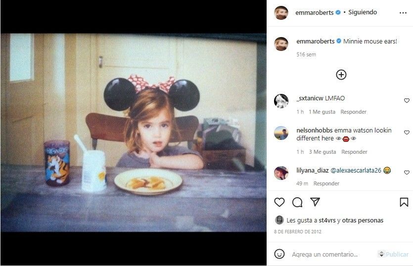 La imagen en cuestión pertenece a Emma Roberts, la actriz norteamericana que además es sobrina de Julia Roberts. De hecho, la protagonista de American Horror Story y Scream Queens, compartió dicha imagen a través de su cuenta de Instagram en el año 2012, acompañado de la frase "orejas de Minnie Mouse!".