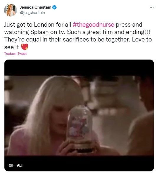 En su cuenta de Twitter escribió: "Recién llegué a Londres para la prensa de The Good Nurse y miré Splash en televisión. Qué buena película y final. Son iguales en los sacrificios que hacen para estar juntos. Amé verla".