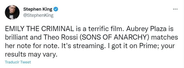 Por su parte, Stephen King escribió en su cuenta de Twitter: "Emily the Criminal es una película estupenda. Aubrey Plaza es brillante y Theo Rossi (SONS OF ANARCHY) la iguala nota por nota".