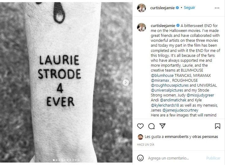 "Un FINAL agridulce para mí en las películas de Halloween", escribió. "He hecho grandes amigos y he colaborado con maravillosos artistas en estas tres películas y hoy mi parte en la película ha finalizado y con ello el FIN para mí de esta trilogía". Curtis acompañó su mensaje con varias fotos de detrás de las cámaras de Halloween Ends.