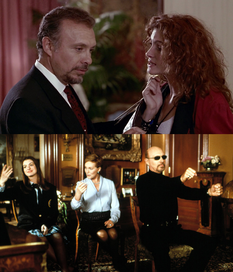 Y esa no es la única escena que es similar. En ambos filmes, las mujeres parecen tener varios inconvenientes al adaptarse a sus nuevos estilos de vida, en especial a lo que modales en la mesa refiere. Tal es así, que hay una escena que es completamente igual en ambas películas. En Mujer Bonita, Vivian está comiendo unos caracoles cuando uno de ellos sale volando por el aire, pero uno de los camareros lo atrapa. Tanto en El diario de la princesa 1 y 2, Mia acude a una cena organizada por su abuela y sufre todo tipo de problemas como llenarse de más la boca, romper un vaso, hasta prender fuego a un camarero. En los tres casos, es el mismo actor quien emite la misma frase “ Ocurre todo el tiempo”.