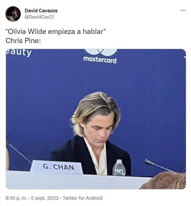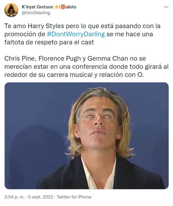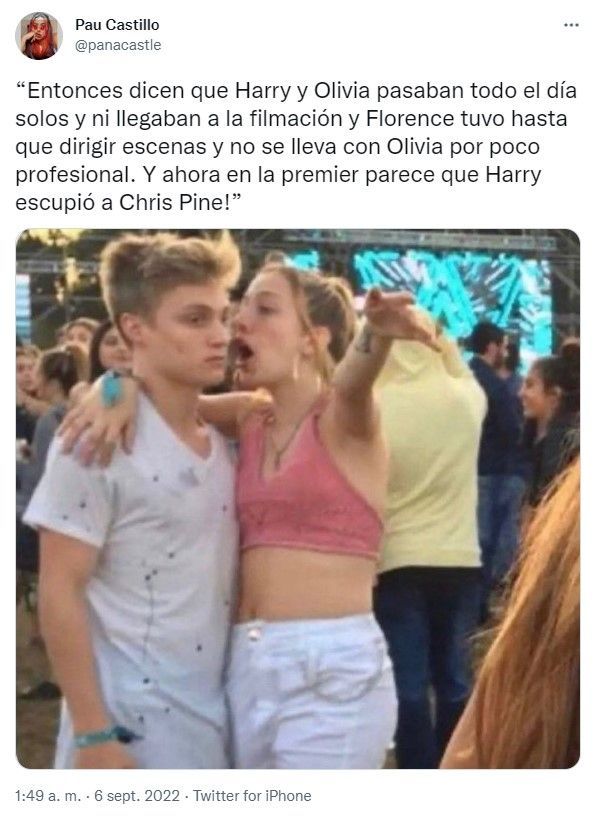 Como era de esperar, las redes sociales no pudieron pasar por alto las reacciones que dejó el paso de la película por el Festival de Venecia. Desde las caras de Chris Pine durante la conferencia de prensa, a la supuesta falta de contacto visual entre Pugh y Wilde, y hasta la supuesta escupida de Styles a Pine tras la proyección. A continuación hacemos una recopilación de los mejores memes y reacciones en redes sociales.