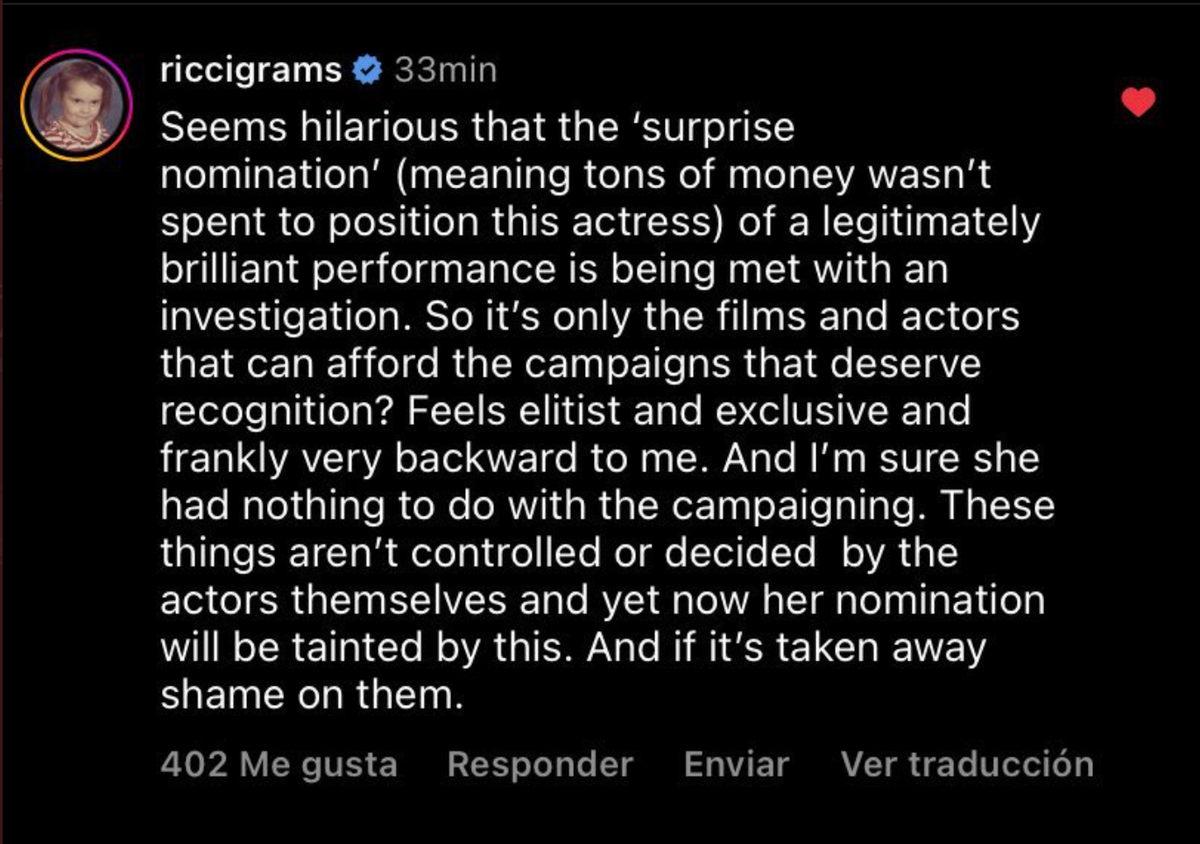 "Parece hilarante que la 'nominación sorpresa' (lo que significa que no se gastaron toneladas de dinero para posicionar a esta actriz) de una actuación legítimamente brillante esté siendo investigada", escribió Ricci en una publicación en su cuenta de Instagram que finalmente eliminó.