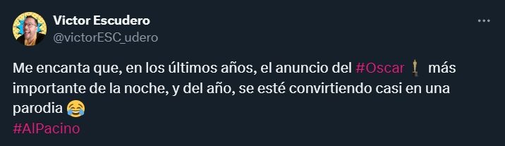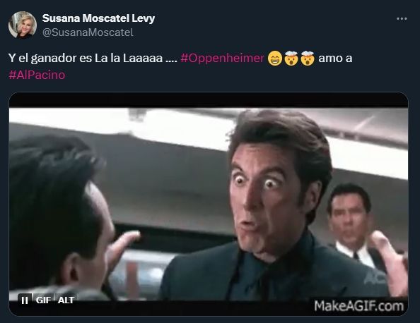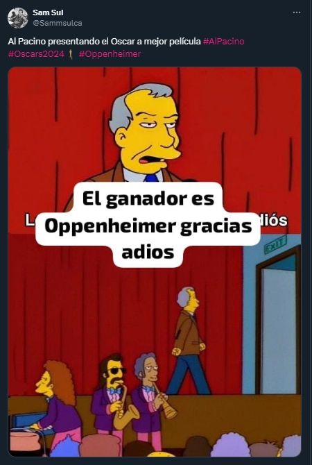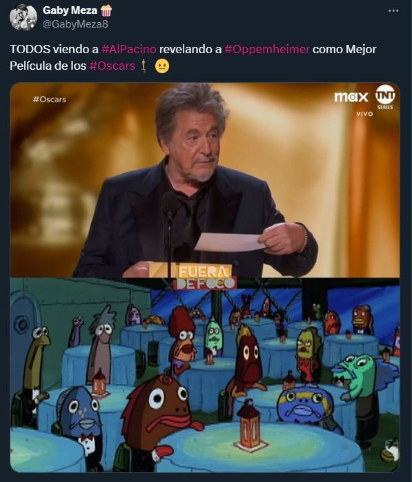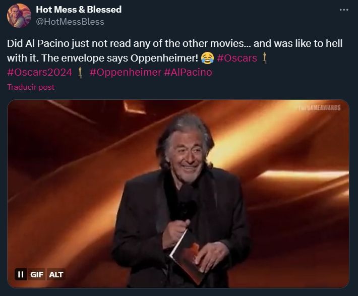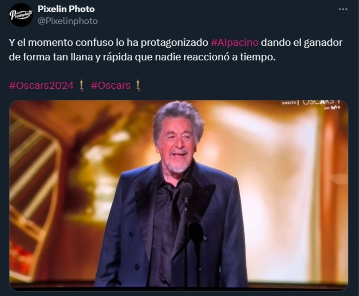 Para hacer entrega del premio, el oscarizado actor apareció en el escenario del Dolby y así sin más, se lanzó a cantar el ganador sin mayores preámbulos. "Mejor Película… uh, tengo que ir al sobre para eso. Y lo haré. Aquí viene. ¿Y mis ojos ven a Oppenheimer?", dijo Al Pacino sin hacer mención alguna de las cintas nominadas, dejando en el aire cualquier tipo de suspenso que se pudiera generar.