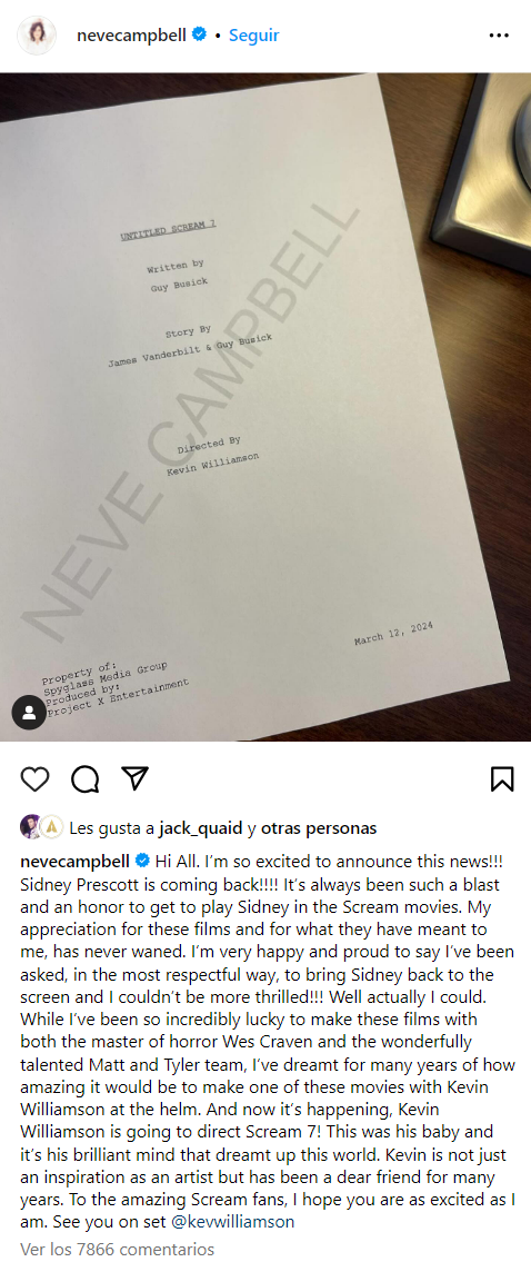 "¡¡¡Estoy muy feliz y orgullosa de decir que me han pedido, de la manera más respetuosa, que traiga a Sidney de vuelta a la pantalla y no podría estar más emocionada!!! Bueno, en realidad podría. Aunque he sido increíblemente afortunada de hacer estas películas tanto con el maestro del terror Wes Craven como el maravillosamente talentoso equipo Matt y Tyler, he soñado durante muchos años lo increíble que sería hacer una de estas películas con Kevin Williamson al timón. ¡Y ahora está sucediendo, Kevin Williamson va a dirigir Scream 7!", anunció la actriz. "Este fue su bebé y es su brillante mente la que soñó este mundo. Kevin no es sólo una inspiración como artista, sino que ha sido un querido amigo durante muchos años. Para los increíbles fans de Scream, espero que estéis tan emocionados como yo", finaliza la publicación, acompañada de una foto del guion de Scream 7 que lleva su nombre.