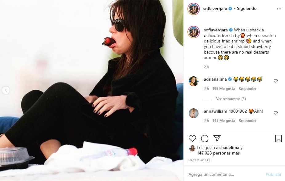 "Cuando estás comiendo una deliciosa papa frita, cuando estás comiendo un delicioso camarón frito, y cuando debes comer una estúpida frutilla porque no hay ningún postre real", escribió Sofía, y produjo las risas de todos.