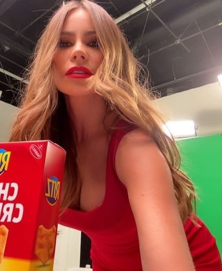 Justamente uno de sus últimos posteos en Instagram es una foto que Sofía Vergara se tomó desde abajo queriendo publicitar una marca de galletas, pero el ángulo de la imagen dejó expuesto el profundo escote que le produjo el espectacular vestido rojo que estaba usando.
