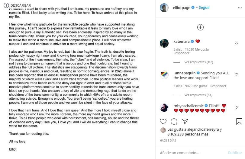 Page publicó un extenso mensaje en su cuenta de Instagram:
