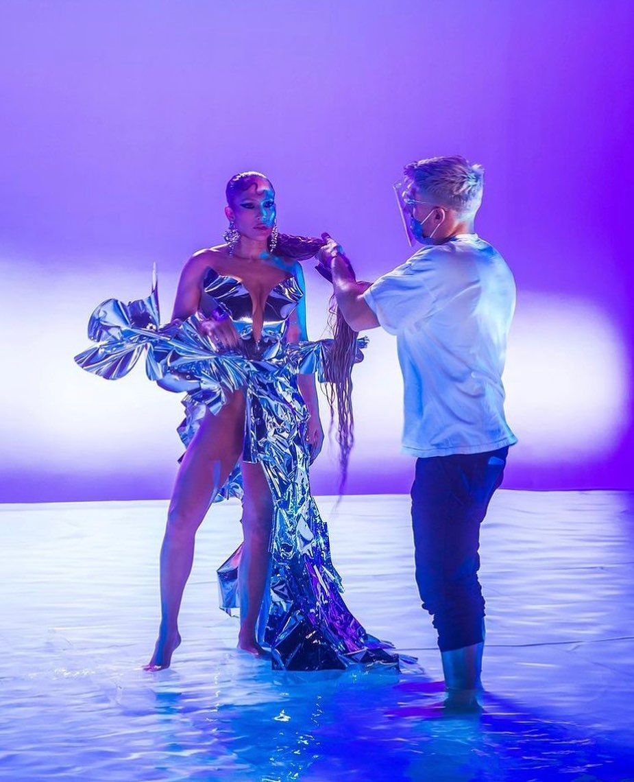 Ahora se conoció una nueva imagen de “In the Morning” y ya causa sensación. Se trata de un detrás de escena, donde tenemos a JLo con un exótico vestido color plata, con sendas aberturas y un escote bien abierto. En la imagen también podemos ver al estilista de las estrellas Chris Appleton, hacer arreglos en el cabello de la diva.