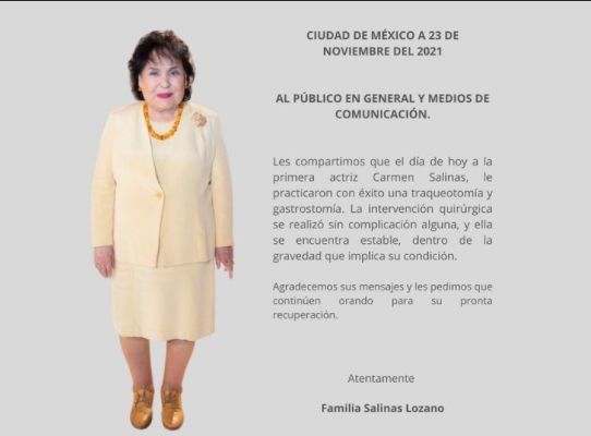 "El día de hoy a la primera actriz Carmen Salinas le practicaron con éxito una traqueotomía y una gastrostomía. La intervención quirúrgica se realizó sin complicación alguna, y ella se encuentra estable, dentro de la gravedad que implica su condición", indicaron en un comunicado que compartieron a través de las redes sociales de la actriz.