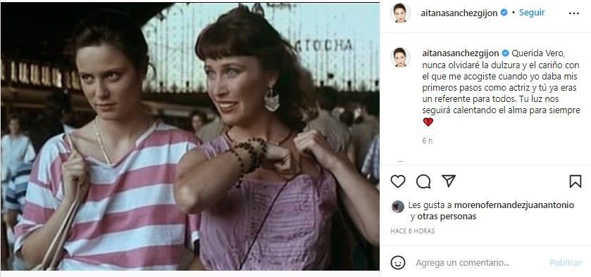 “Querida Vero, nunca olvidaré la dulzura y el cariño con el que me acogiste cuando yo daba mis primeros pasos como actriz y tú eras un referente para todos. Tu luz nos seguirá calentando el alma para siempre”, escribió Aitana Sánchez-Gijón.