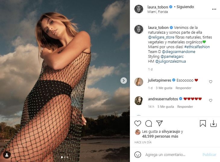 La modelo colombiana se encuentra en la ciudad norteamericana de Miami, en el estado de Florida, y aprovechó para promocionar su marca de ropa con un mensaje ambientalista. "Venimos de la naturaleza y somos parte de ella. Fibras naturales, tintes vegetales y materiales orgánicos Miami por unos días!", fue el mensaje con el que acompañó la publicación en su cuenta de Instagram.