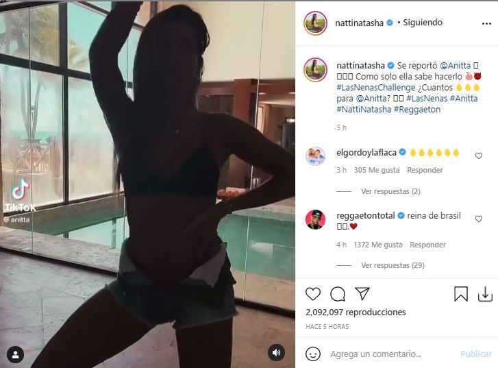 "Se reportó @Anitta. Como solo ella sabe hacerlo #LasNenasChallenge ¿Cuantos para @Anitta?", fue el divertido mensaje con el que Natti Natasha acompañó la publicación.