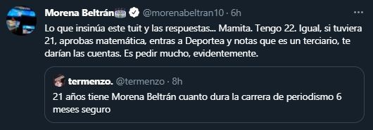 Luego otro usuario cuestionó la formación de la joven periodista. "21 años tiene Morena Beltrán. ¿Cuánto dura la carrera de periodismo? Seis meses seguro", escribió.