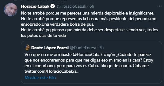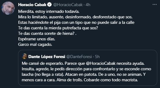 "Veo que no me arrobaste @HoracioCabak cagón ¿Cuándo te parece que nos encontremos para que me digas eso mismo en la cara? Estoy en el conurbano, pero para vos es Cuba. Tilingo de cuarta. Cobarde", lo cruzó López Foresi.