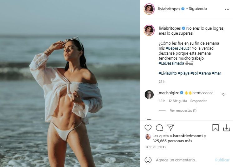"¡No eres lo que logras, eres lo que superas! ¿Cómo les fue en su fin de semana mis #BebesDeLuz? Yo la verdad descansé porque esta semana tendremos mucho trabajo #LaDesalmada", fue el mensaje con el que Livia acompañó la publicación en su cuenta de Instagram.
