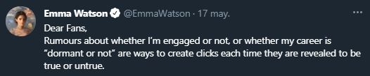 "Queridos fans, los rumores sobre si estoy comprometida o no, o si mi carrera está inactiva o no, son formas de generar clics cada vez que se revela si son verdaderos o falsos", escribió la actriz en su cuenta de Twitter, donde no escribía desde agosto de 2020.