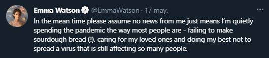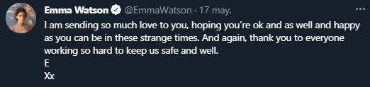 "Les mando mucho amor y espero que estén bien y tan felices como puedan en estos tiempos extraños. Y de nuevo, gracias a todos los que están trabajando duro para mantenernos sanos y salvos", concluyó su descargo Watson.