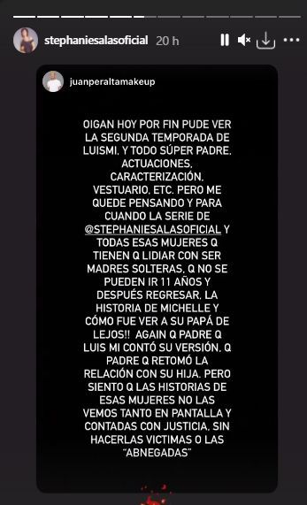 "Oigan, hoy por fin pude pude ver la segunda temporada de Luismi. Y todo súper padre, actuaciones, caracterización, vestuario, etc., pero me quedé pensando y ¿para cuándo la serie de Stephanie Salas y todas esas mujeres que tienen que lidiar con ser madres solteras?", fue el picante mensaje de un usuario que compartió Stephanie Salas en sus redes sociales.