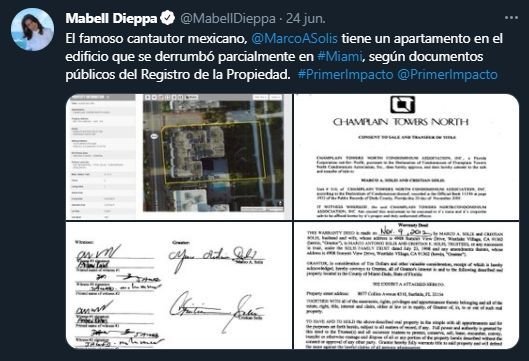 Dieppa difundió la información a través de su cuenta de Twitter. "El famoso cantautor mexicano @MarcoASolis tiene un apartamento en el edificio que se derrumbó parcialmente en #Miami, según documentos públicos del Registro de la Propiedad", informó la periodista.
