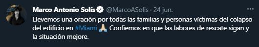 "Elevemos una oración por todas las familias y personas víctimas del colapso del edificio en #Miami Manos palma contra palma Confiemos en que las labores de rescate sigan y la situación mejore", escribió en su cuenta de Twitter el cantante.