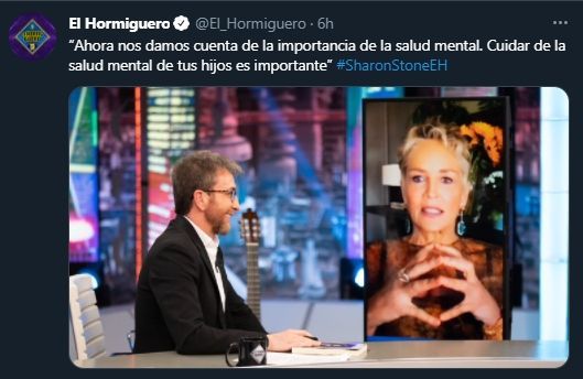 La actriz estadounidense Sharon Stone estuvo de visita este lunes en el programa español 'El Hormiguero', de Antena 3, donde fue entrevistada por Pablo Motos, con quien repasó su carrera cinematográfica y habló de su libro de memorias titulado 'La belleza de vivir dos veces'.