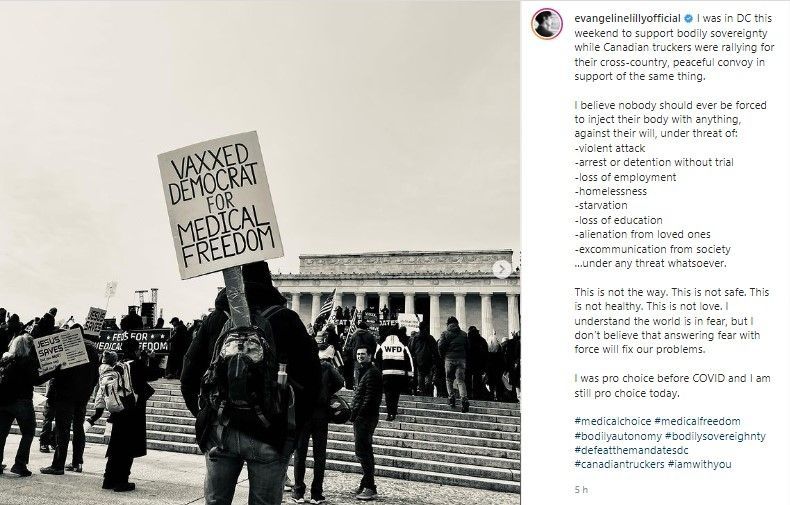 En las últimas horas, la actriz compartió una publicación en su cuenta de Instagram en donde mostró que acudió a una protesta contra el mandato de vacunas. “Estuve en DC este fin de semana para apoyar la soberanía corporal mientras los camioneros canadienses se unían de forma pacífica en apoyo de lo mismo”, escribió la intérprete de 42 años en la red social.