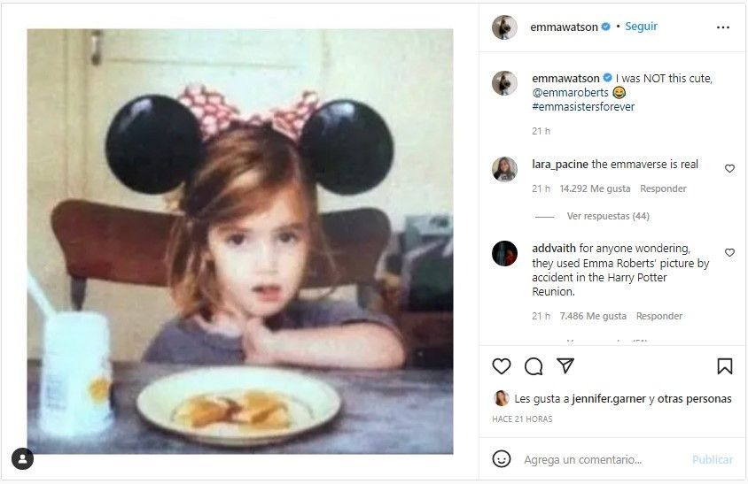 Luego de que la imagen se volviera viral, HBO Max corrigió el error. Sin embargo, Emma Watson no dejó pasar por alto el detalle y se refirió a ello en su cuenta de Instagram. "Yo no era tan linda, @emmaroberts ?? #emmasistersforever", escribió la actriz de 31 años en su red social, acompañada de la imagen en cuestión.