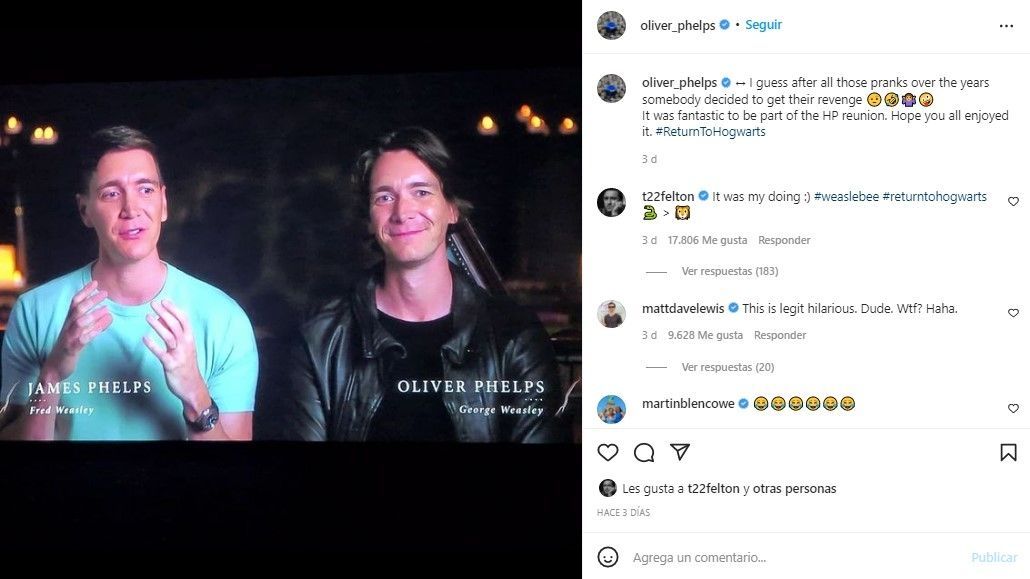 Sin embargo, este no fue el único error. En otro momento del especial donde hacen su aparición James y Oliver Phelps, los actores que dan vida a los gemelos Weasley, también fueron víctimas de otra confusión.