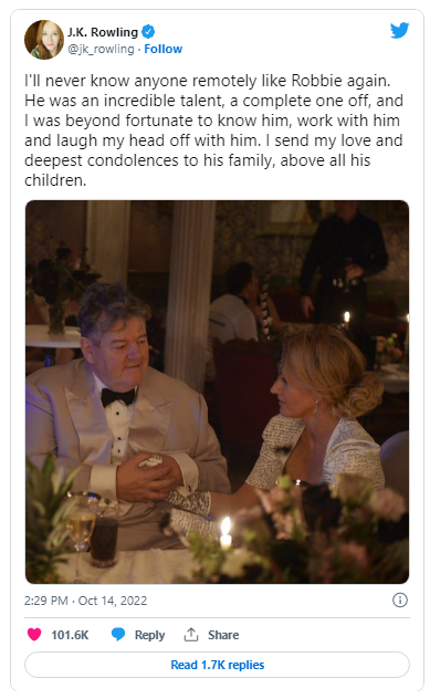 La autora de Harry Potter, J.K. Rowling también se sumó a los mensajes para recordar al fallecido actor. A través de Twitter, la escritora publicó: “Nunca volveré a conocer a nadie remotamente como Robbie. Tenía un talento increíble, completamente único, y fui más que afortunado de conocerlo, trabajar con él y reírme a carcajadas con él. Envío mi cariño y más sentido pésame a su familia, sobre todo a sus hijos”.