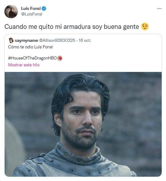 Uno de los últimos en sumarse a esta ola de memes es Luis Fonsi, quien realizó una publicación en su cuenta de Twitter que se llevó la complicidad de sus seguidores. El artista respondió a un tweet de un usuario que había compartido una imagen de Ser Criston Cole, el personaje interpretado por Fabien Frankel. El tweet de este usuario decía: "Cómo te odio Luis Fonsi", haciendo referencia al parecido físico entre el actor de la serie de HBO y el cantante puertorriqueño.