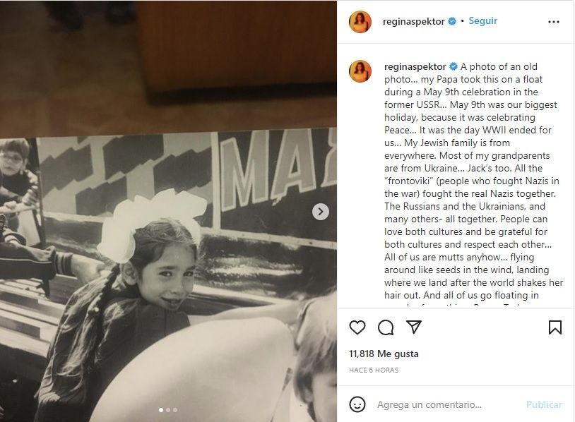 “Una foto de una foto vieja, mi papá tomó esto en una carroza durante una celebración del 9 de mayo en la antigua URSS. El 9 de mayo fue nuestra fiesta más grande, porque estaba celebrando la Paz. Fue el día en que terminó la Segunda Guerra Mundial para nosotros. Mi familia judía está en todas partes. La mayoría de mis abuelos son de Ucrania Jack también. Todos los "frontoviki" (personas que lucharon contra los nazis en la guerra) lucharon juntos contra los verdaderos nazis. Los rusos y los ucranianos, y muchos otros, todos juntos”, reza una parte del posteo de la artista nacida en Rusia y emigrada a Nueva York a finales de los 80.