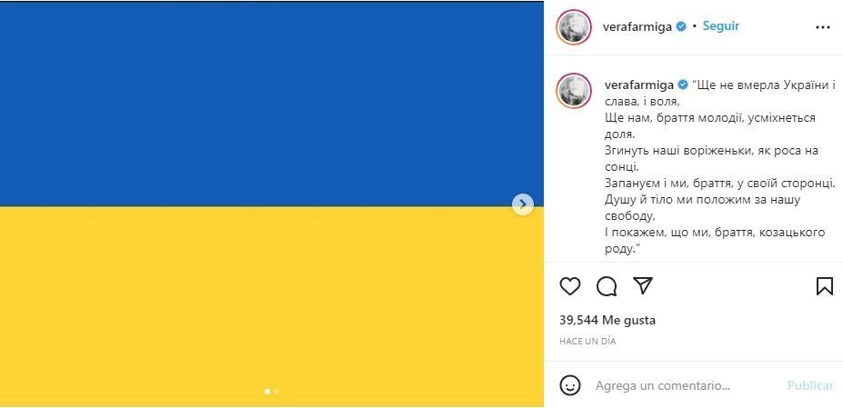 Vera Farmiga, reconocida actriz que participó de éxitos como la saga de The Conjuring o la reciente serie de Marvel, Hawkeye, compartió en su cuenta de Instagram la bandera de Ucrania con el hashtag #IStandWithUkraine y con algunas de las estrofas del himno de Ucrania, ya que sus padres son oriundos del país invadido.