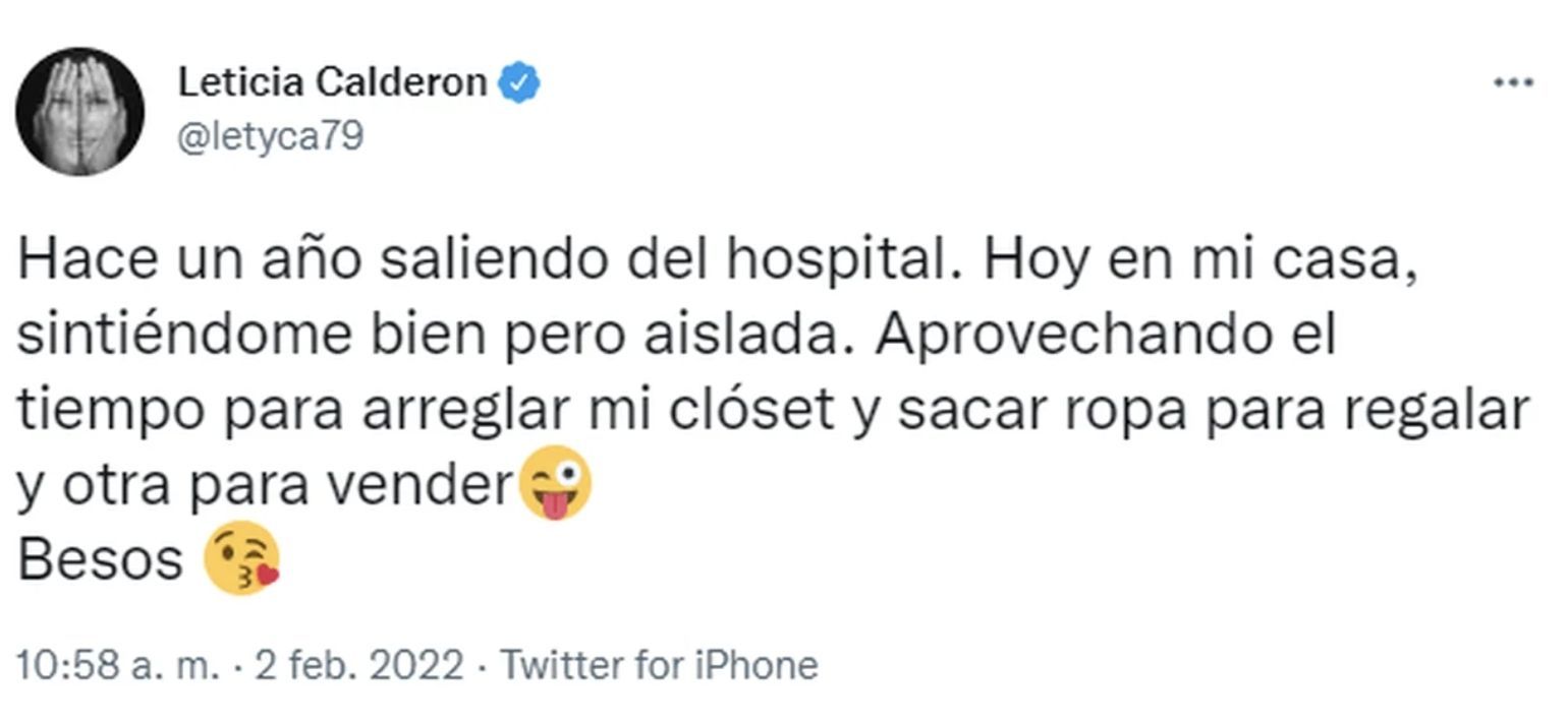 "Hace un año saliendo del hospital. Hoy en mi casa, sintiéndome bien pero aislada. Aprovechando el tiempo para arreglar mi clóset y sacar ropa para regalar y otra para vender. Besos", escribió en Twitter.