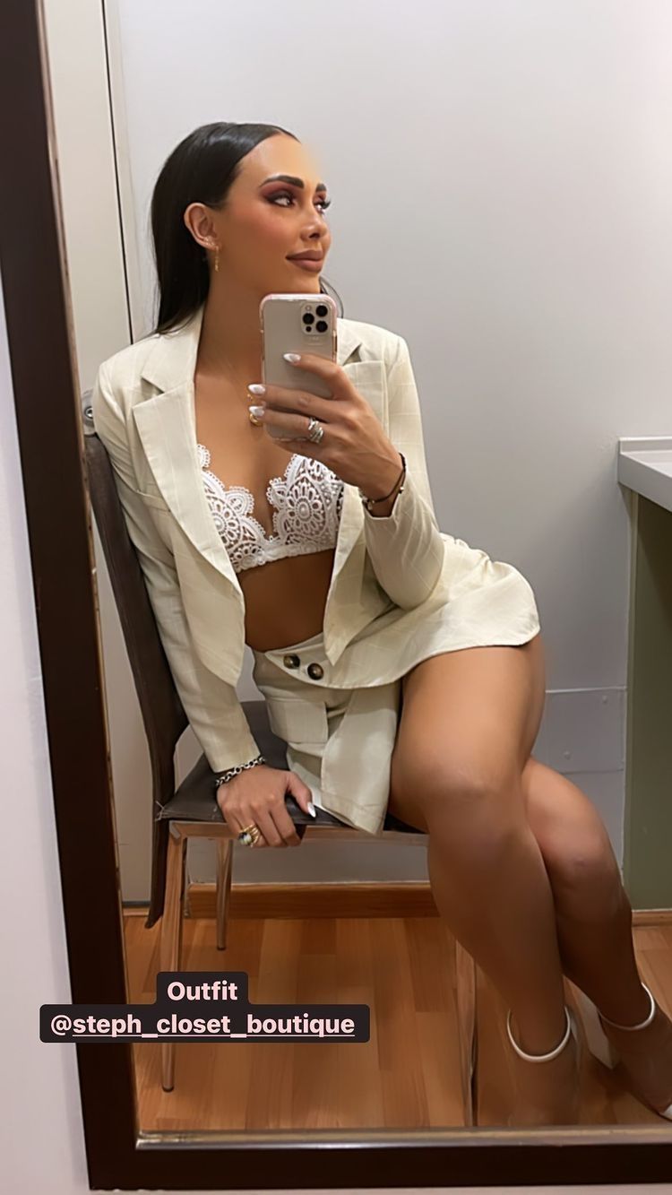 En las últimas horas, Macky compartió en sus historias de Instagram el último atuendo que lució en el programa, dejando ver sus torneadas piernas con una minifalda que combinó con un elegante bralette blanco.
