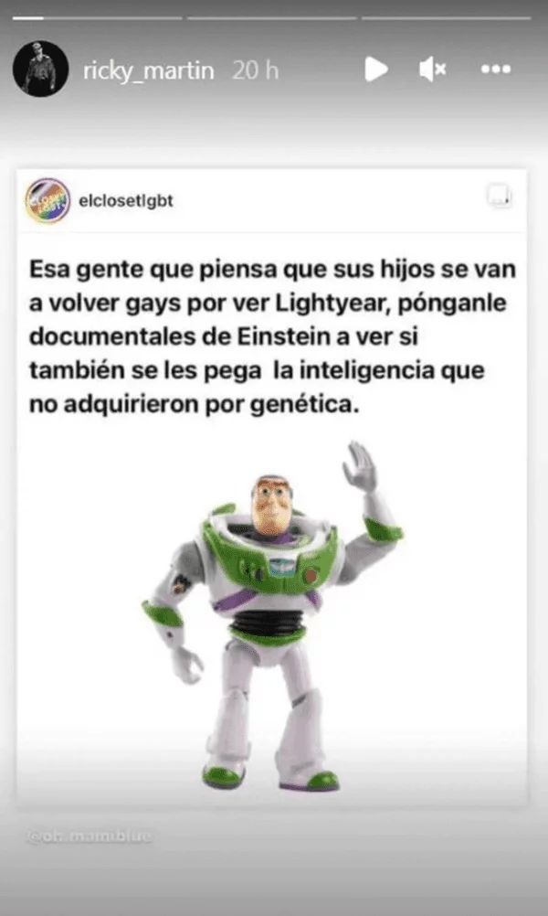 "Esa gente que piensa que sus hijos se van a volver gays por ver Lightyear, póngale documentales de Einstein a ver si también se les pega la inteligencia que no adquirieron por genética", se lee en la publicación que Ricky Martin compartió en una historia de su perfil de Instagram.