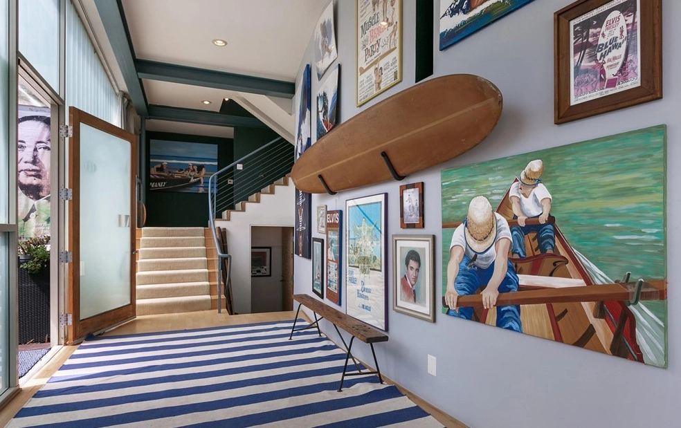 Construida en 1993, la casa cuenta con una estructura de vidrio y acero, rodeada por escaleras interiores y exteriores que conectan distintas partes de la propiedad. La decoración náutica está presente en todos los ambientes, con elementos y cuadros inspirados en la temática. Otros aspectos destacados incluyen un comedor que se conecta a una cocina estilo galera equipada con electrodomésticos Bosch, Dacor y KitchenAid, además de gabinetes de madera, encimeras de concreto, una despensa y una cava con control de temperatura.